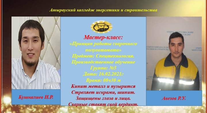Атырау энегетика және құрылыс колледжінде жылдық жоспарға сай, 2021 жылдың 15-19 ақпан аралығы «Темірден түйін түйетін мамандық» тақырыбында «Пісіру ісі» пән бірлестігінің апталығының жоспарырына сай арнайы технология және өндірістік оқыту бойынша сынып шебері өткізілді. Пән оқытушысы: Кушкалиев Н.Р және өндірстік оқыту шебері Авезов Р.У. .