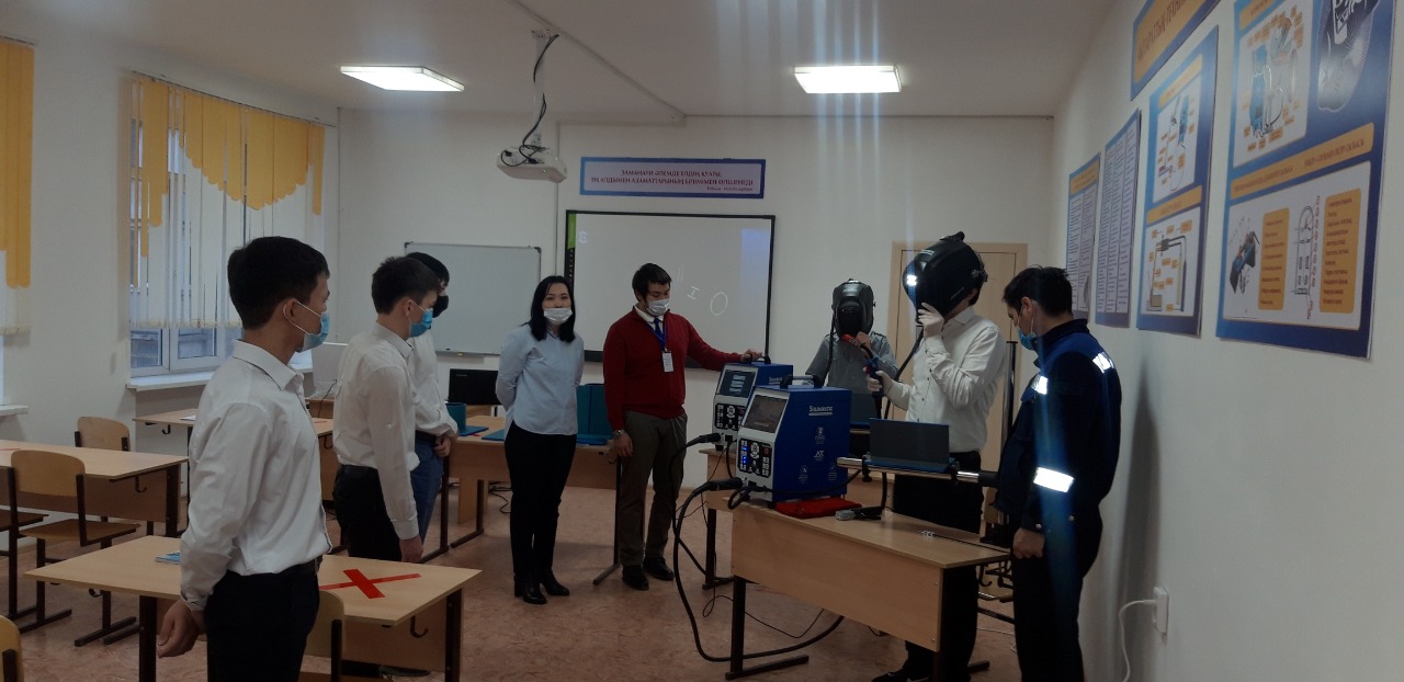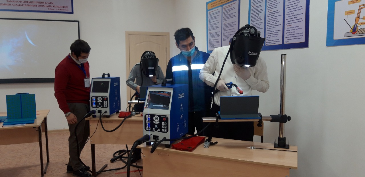 Мастер-класс: «Дәнекерлеу жартылай автоматының жұмыс принципі» Сабақтың мақсаты: педагогикалық шеберлікті және кәсіби тұрақтылықты қалыптастыру, студенттердің әлеуеті мен шығармашылық дербестігін қамтамасыз ету және “SALDAMATIK” дәнекерлеуші-тренажерінде дәнекерлеу аппаратының жұмыс принципін көрсету. Студенттерді еңбекқорлыққа, ұғыпталыққа тәрбиелеу арқылы пісіру жұмыстары құралдарын соның ішінде «Жас маман» жоба бойынша келген құрылғы «Тренажер сварщигі» қауіпсіздік ережесіне сай пайдалануға үйрету.