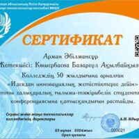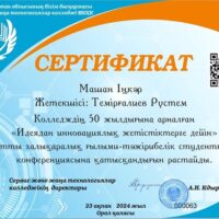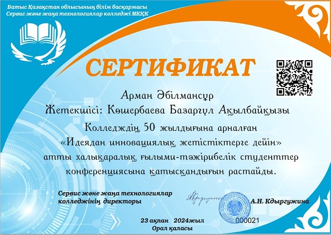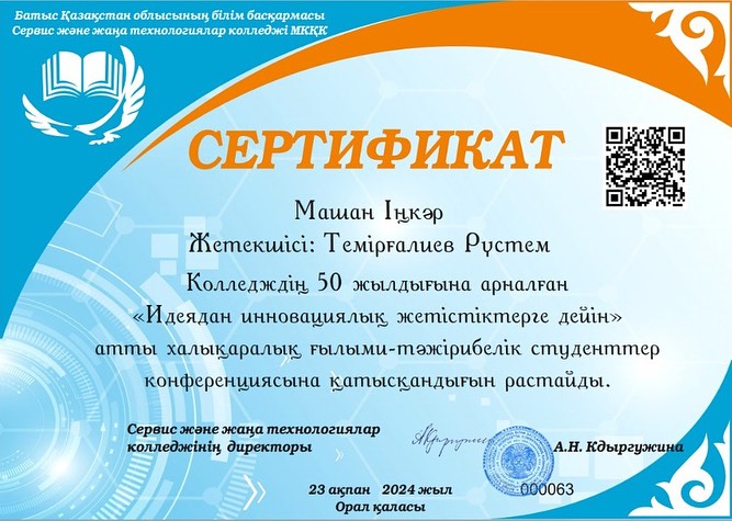 Батыс Қазақстан облысы білім беру басқармасы Сервис және жаңа технологиялар колледжінің 50 жылдығына арналған «Идеядан инновациялық жетістіктерге дейін» атты халықаралық ғылыми-тәжірибелік студенттердің конференция жұмысы қатынасып сертификатпен марапатталды