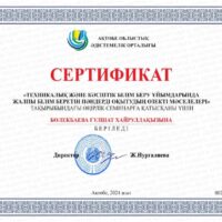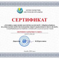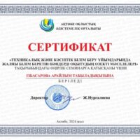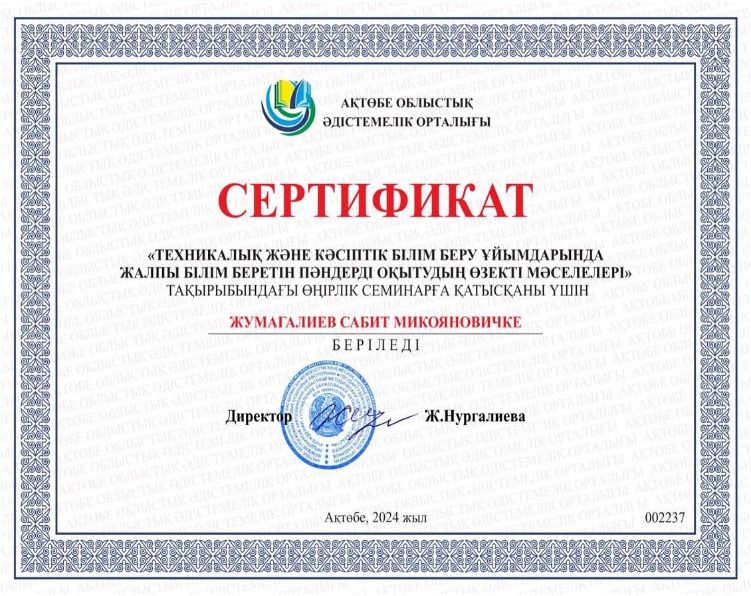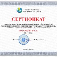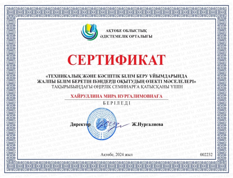 Ақтөбе облыстық әдістемелік орталығы ұйымдастыруымен «Техникалық және кәсіптік білім беру ұйымдарында жалпы білім беретін пәндерді оқытудың өзекті мәселелері» тақырыбында өңірлік семинар жұмысына колледжіміздің жалпы білім беретін пәндер оқытушылары қатынасып сертификпен марапатталды.