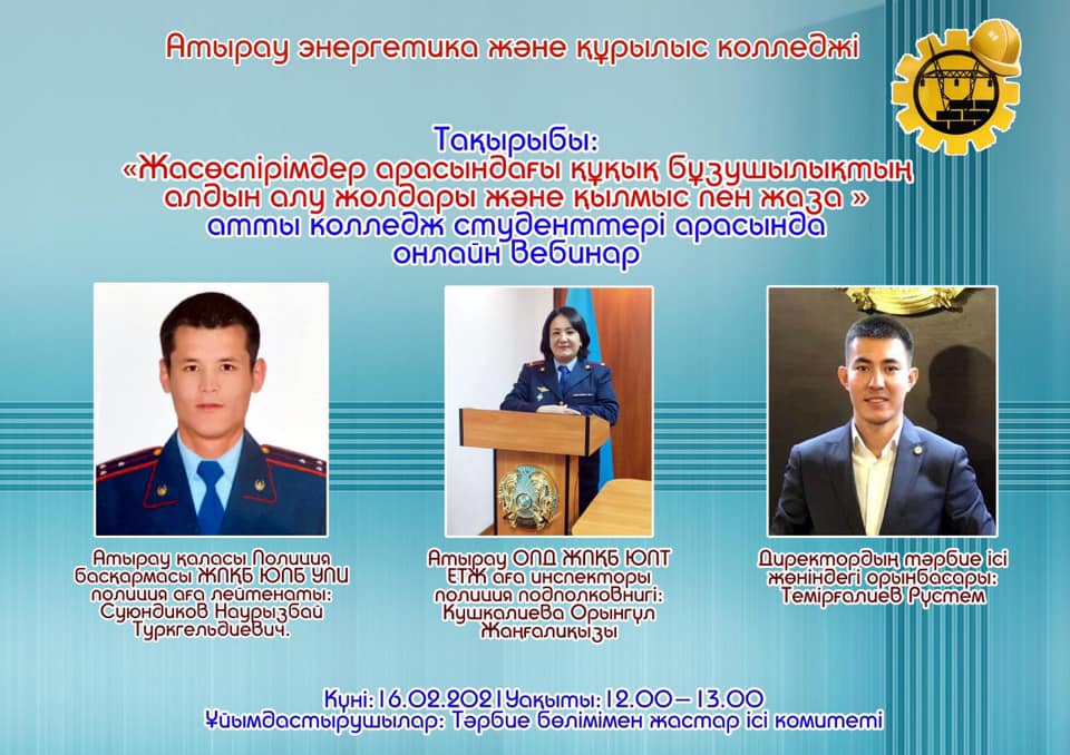2020 жылдың 16 ақпан күні Атырау энергетика және құрылыс колледжі жылдық жоспарға сәйкес Тақырыбы: «Жасөспірімдер арасындағы құқық бұзушылықтың алдын алу жолдары және қылмыс пен жаза» атты колледж студенттері арасында ZOOM платформасында онлайн вебинар кездесу өтті.