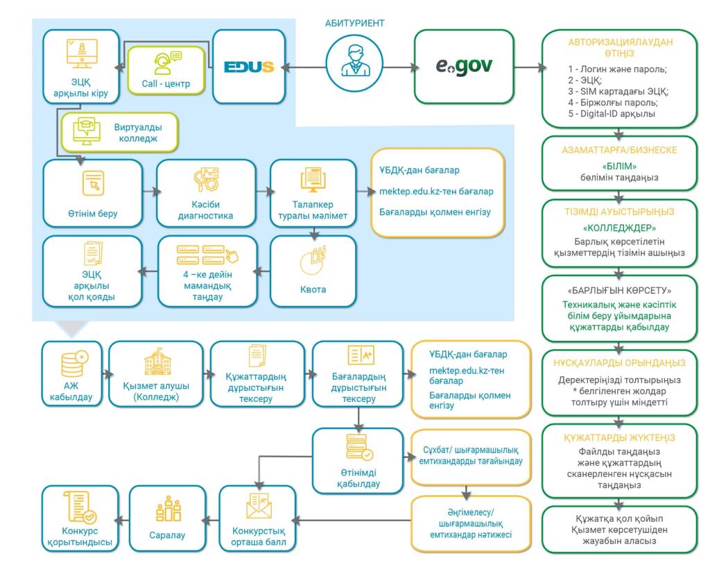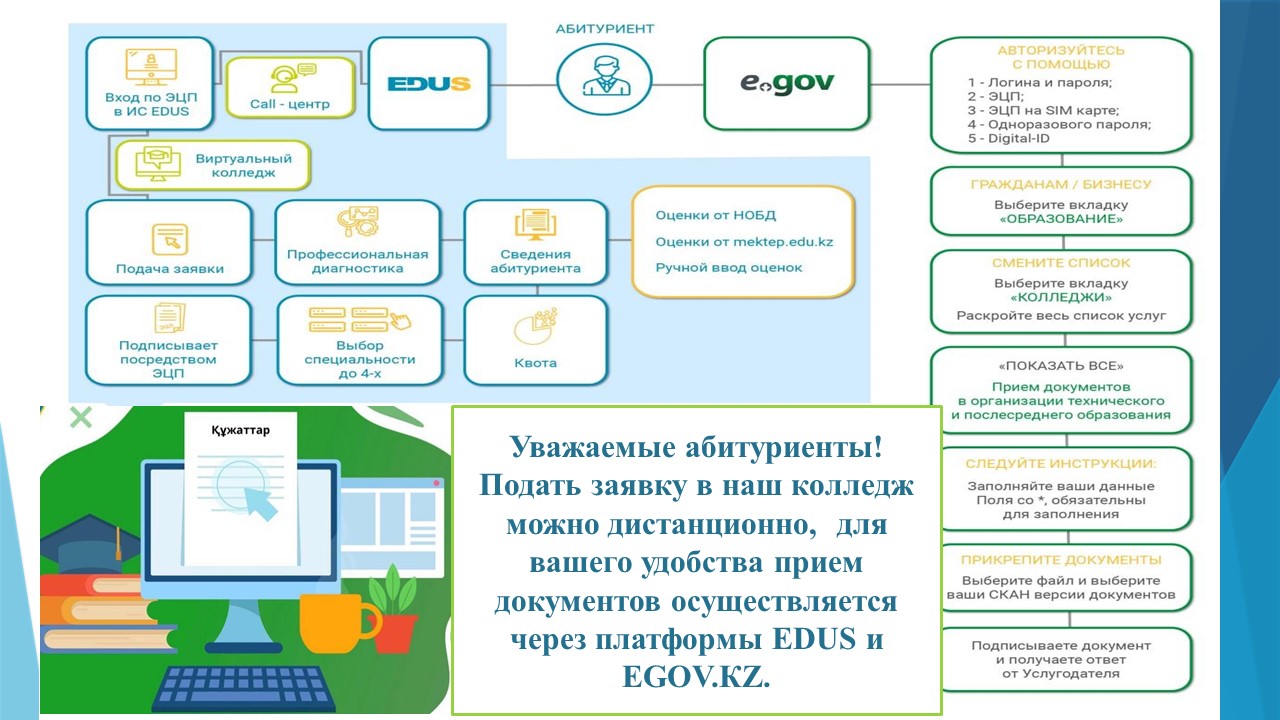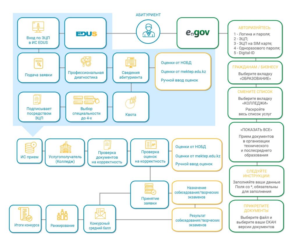 Пошаговая инструкция по приему документов абитуриентов в колледж, организации технического и профессионального, послесреднего образования Республики Казахстан. Для подачи документов необходима ЭЦП (электронно-цифровая подпись) родителя или абитуриента. После заполнения и подачи всех данных и документов заявка отправляется на рассмотрение выбранного колледжа.